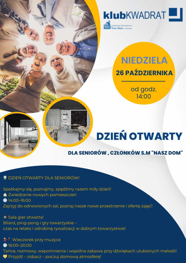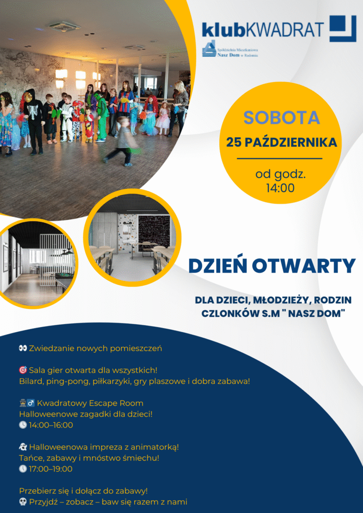 Zapraszamy wszystkich mieszkańców – dzieci, rodziców i seniorów – na wyjątkowy Weekend Otwarty w Klubie Kwadrat, który odbędzie się 25–26 października 2025 roku przy ul. Grzybowskiej 16.